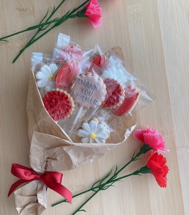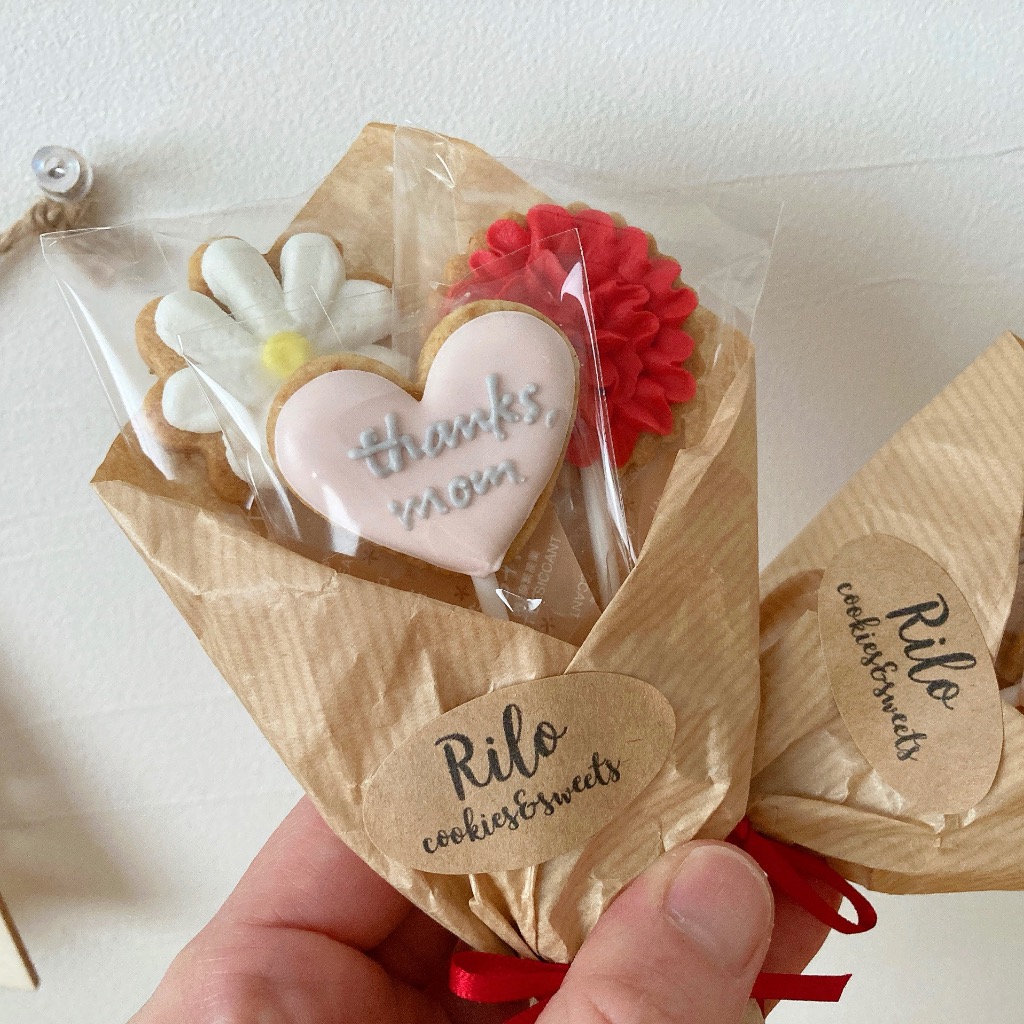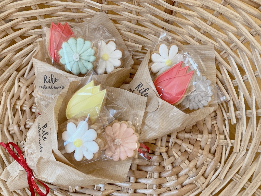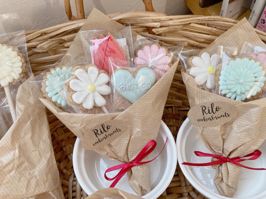 メッセージ入りの花束クッキーがとても人気です!店頭ではお好きなお花を選んでいただいてその場でお包みします!