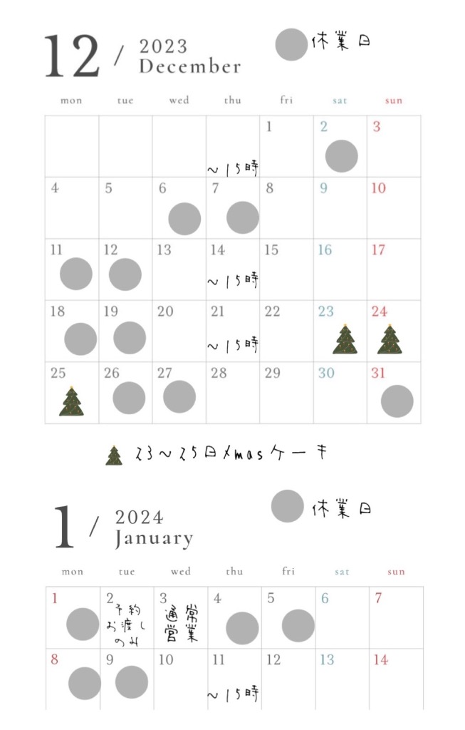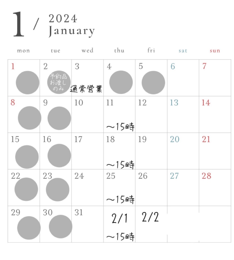 1月の営業カレンダー